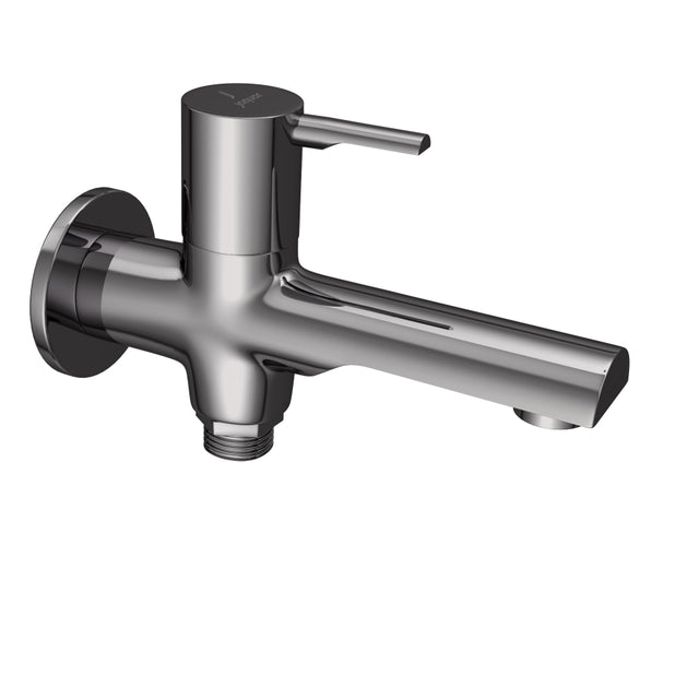 This 2-Way Bib Cock in sleek Black Chrome from Jaquar's Florentine Prime collection delivers modern sophistication to contemporary bathrooms and kitchens. The wall-mounted faucet provides effortless control over hot and cold water supplies with a secure flange installation. The dark metallic finish resists fingerprints and smudges while maintaining a polished, upscale appearance. Engineered for durability and style, it combines minimalist design with reliable functionality for discerning homeowners seeking underst