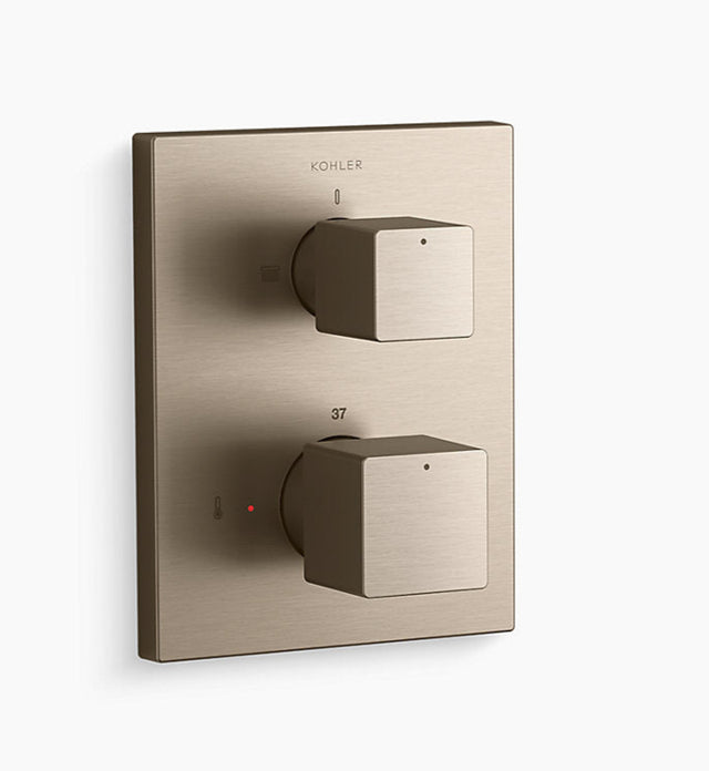 The Kohler AutoSense® Thermostatic Bath & Shower Valve Trim (K-20742IN-9FP) features a modern square design with dual handles for temperature and water outlet control. Built with durable metal and corrosion-resistant KOHLER finishes, it ensures lasting performance and adds contemporary elegance to your bathroom.