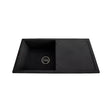 Futura Natural Quartz single bowl sink with drain board in elegant black finish. Measuring 863x432mm (34.52" x 17.28") with an 8-inch depth, this expansive sink combines a generous washing bowl with an integrated drain board for efficient dish handling. The natural quartz material provides exceptional resistance to scratches, stains, and heat damage while staying easy to clean. Includes FA-05A waste coupling for simple installation. Perfect for kitchens where you need maximum functionality and a sophisticated look without compromising on durability or maintenance ease.