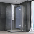 This frameless corner enclosure features two fixed 8mm clear glass panels and one openable door, all secured with a front panel for added stability. Equipped with durable G-G hinges from Jaquar, it offers smooth door operation and a sleek, modern appearance. Designed for spaces ranging from 2000 to 2400mm, this enclosure delivers a minimalist, elegant solution that maximizes bathroom space while ensuring long-lasting reliability.