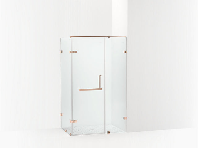 Discover luxury in your corner shower with the Kohler Singulier 1-Door/2-Partition L-Shape Enclosure in rose gold. This premium fixture intelligently utilizes corner space with its L-shaped design and two partition panels for optimal water containment. The single inward-opening door provides seamless access and smooth operation. Rose gold's warm, contemporary finish adds timeless sophistication and visual interest to your bathroom. Crafted with Kohler's renowned quality and precision, this enclosure combines practical design