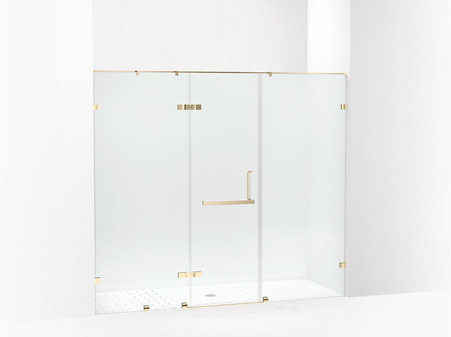 Elevate your shower experience with the Kohler Singulier 1-Door/2-Partition Straight Enclosure in French gold. This premium fixture combines sophisticated design with practical performance, featuring a single hinged door and two partition walls that effectively manage water containment. The straightforward layout provides ample showering space while maintaining a sleek, uncluttered appearance. French gold's luxurious finish radiates warmth and refinement throughout your bathroom. Built with Kohler's exacting craftsmanship standards, this enclosure delivers reliable, smooth operation and lasting beauty for your everyday sanctuary
