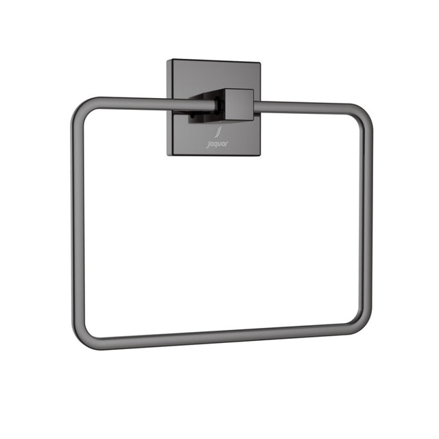 Bold square towel ring in striking black chrome, delivering contemporary edge to modern bathroom spaces. This JAQUAR KUBIX PRIME accessory combines sleek geometric styling with robust construction, providing a distinctive accent with visual impact. The dark metallic finish creates dramatic contrast while maintaining a sophisticated, professional appearance. Ideal for bathrooms embracing current design trends with a fixture that balances minimalist aesthetics and reliable everyday performance.
